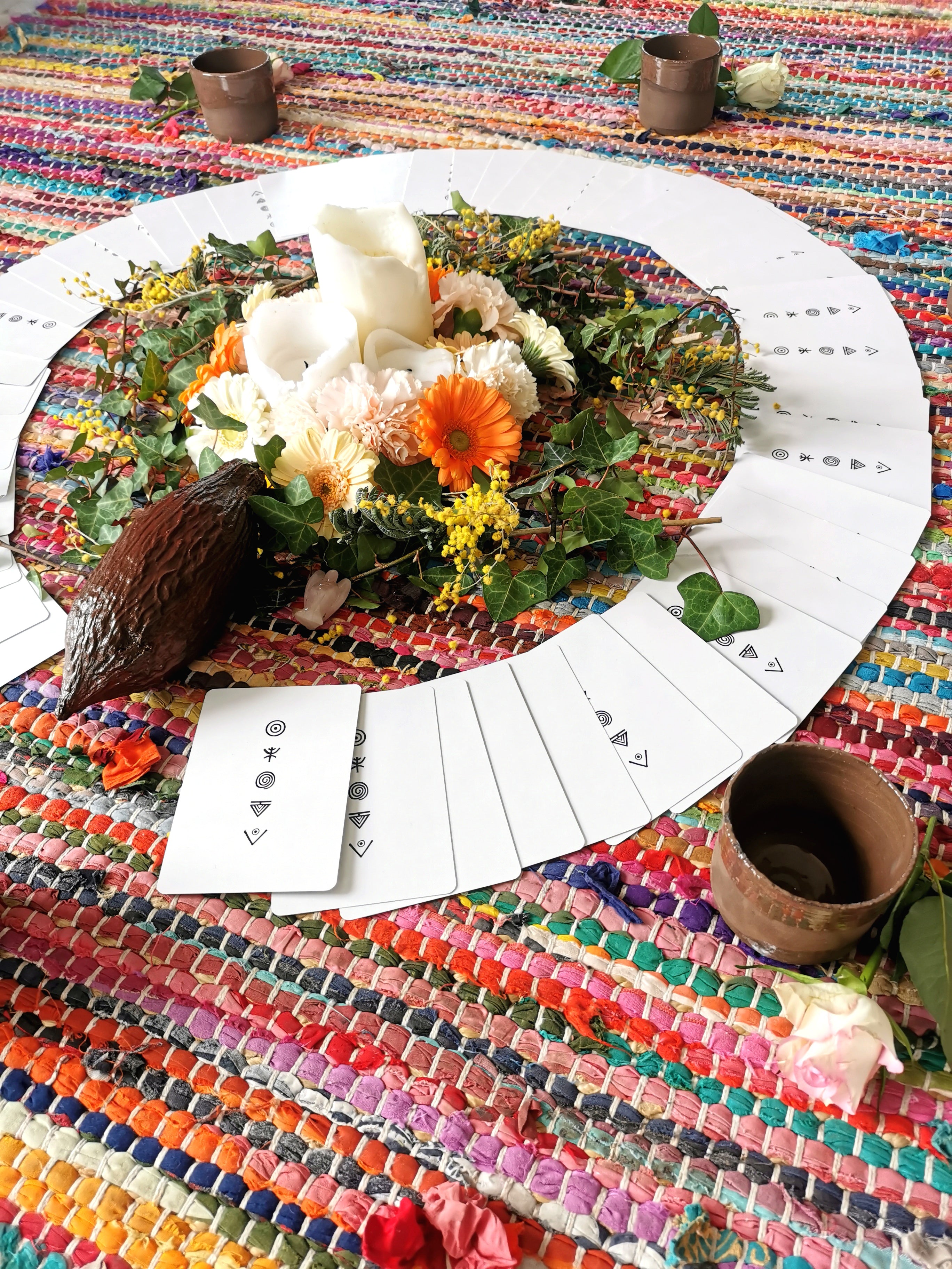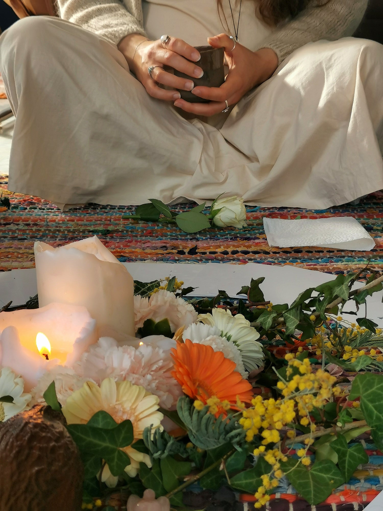 Le jour J, je viens un peu en avance du RDV donné aux invitées, pour préparer l'espace qui va vous recevoir. Nous ouvrons la cérémonie par une méditation guidée permettant de profiter d'un petit moment de relaxation afin que chacune puisse trouver sa place dans le cercle.